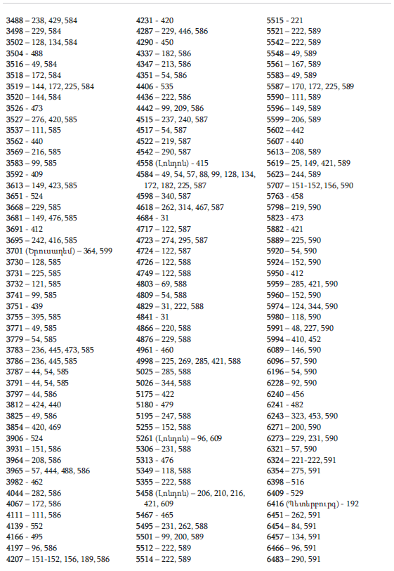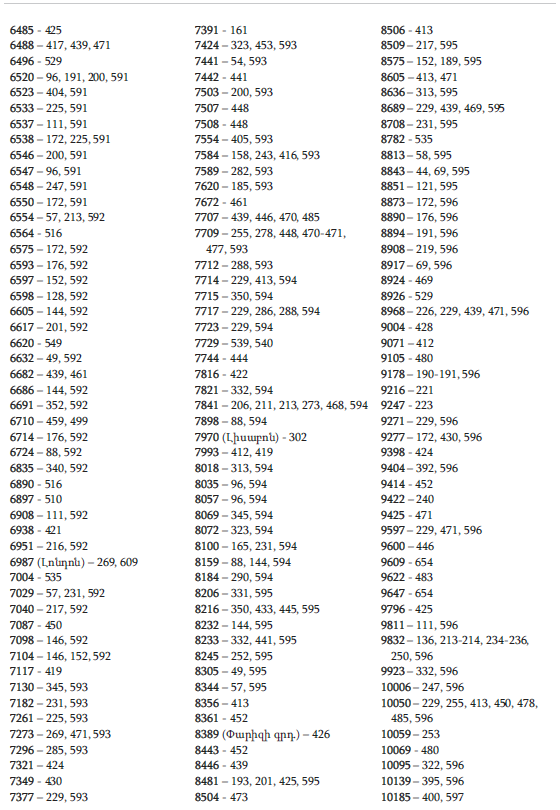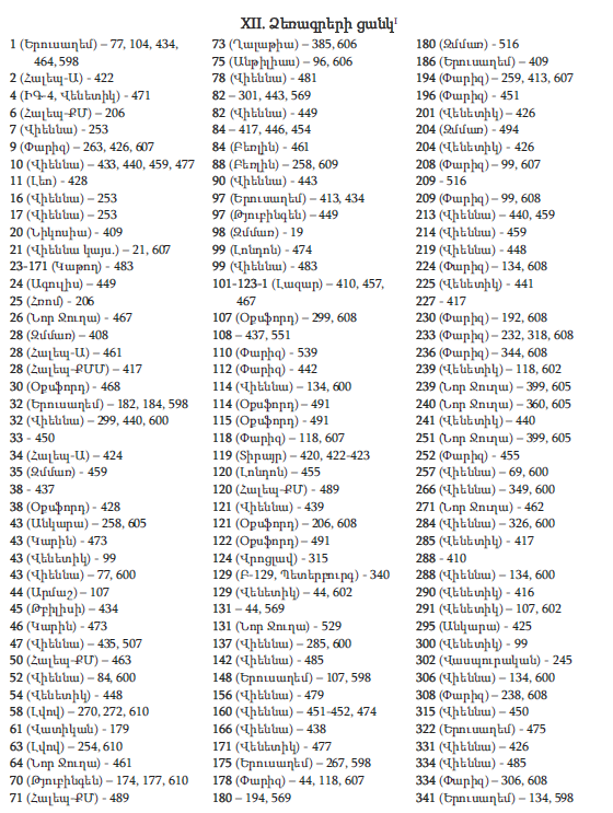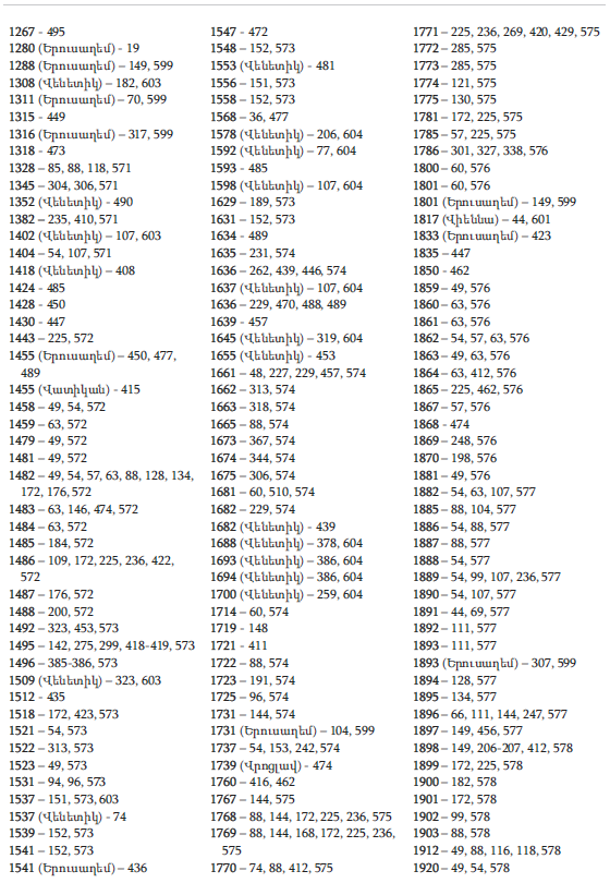 Փակագծերում նշված է այն մատենադարանի, թանգարանի, գրադարանի կամ ձեռագրացուցակի անվանումը, որտեղ գտնվում, կամ նկարագրված է տվյալ ձեռագիրը: Նրանց լրիվ անվանումները ներկայացված է VIII (Գրքում կիրառված համառոտագրու-թյուններ) հավելվածում (էջ 669-670): Նշում չի կատարված Երևանի Մատենադարանում գտնվող ձեռագրերի կողքը: Ձեռագրա-ցանկում չեն ընգրկվել IV (Ձեռագրերն ըստ հիմնական պատմիչների) հավելվածում նշված ձեռագրերը: